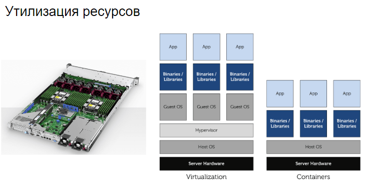 Docker — это ПО для создания приложений на основе контейнеров. Контейнеры и виртуальные машины решают одну задачу, но делают это по-разному. Контейнеры занимают меньше места, т.к. переиспользуют большее количество общих ресурсов хост-системы чем VM, т.к. в отличие от VM, обеспечивает виртуализацию на уровне ОС, а не аппаратного обеспечение. Такой подход обеспечивает меньший объем занимаемого места на жёстком диске, быстрое развертывание и более простое масштабирование.