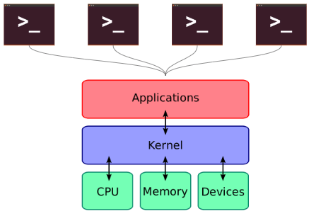 Коротко говоря, через терминал можно получать доступ не только к приложениям и ядру, но и процессору, памяти и подключённым устройствам