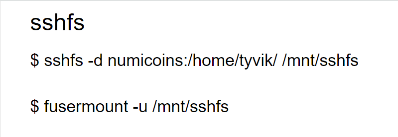$ sshfs -d numicoins:/home/tyvik/ /mnt/sshfs