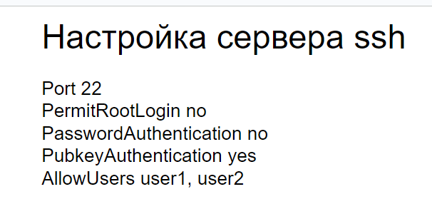 PubkeyAuthentication yes - Разрешение входа только определённым пользователям: