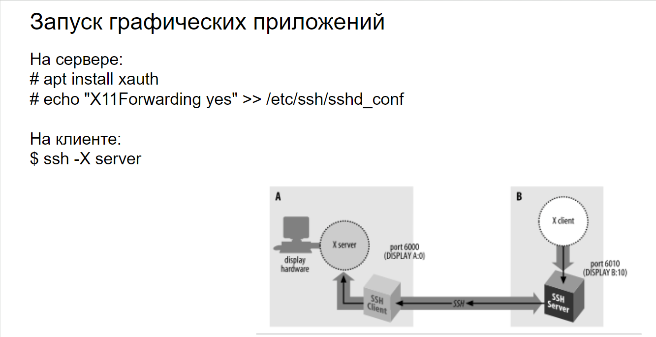 # echo "X11Forwarding yes" >> /etc/ssh/sshd_config - Перезапуск SSH демона: