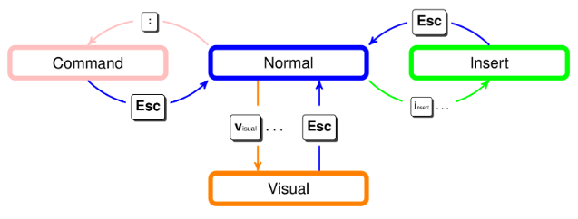 Нормальный - запускается по умолчанию, Командный - для ввода различных команд, Вставка - для манипуляций с текстом, Визуальный - для навигации по документу